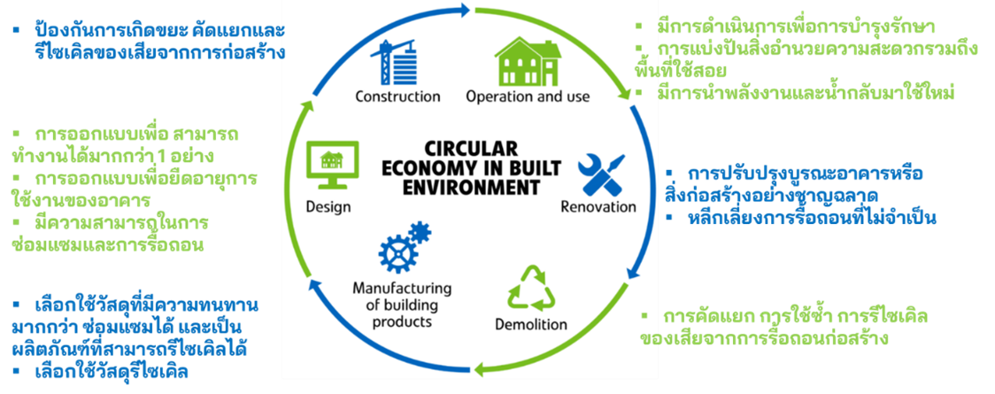 ดังนั้น จึงมีการนำแนวคิดที่เรียกว่า แนวคิดเศรษฐกิจหมุนเวียน หรือ Circular Economy มาปรับใช้เพื่อนำไปสู่ความยั่งยืนในมุมของอุตสาหกรรมก่อสร้าง ช่วยแก้ปัญหาได้อย่างมีศักยภาพในหลายภาคส่วนเนื่องจากเกี่ยวข้องกับการใช้ทรัพยากรและพลังงานอย่างมีประสิทธิภาพมากขึ้นซึ่งนำไปสู่การลดของเสียและลดผลกระทบต่อสิ่งแวดล้อมของวัฏจักรผลิตภัณฑ์
