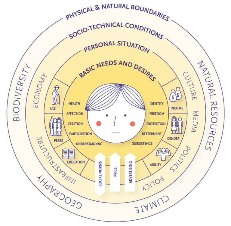 ปัจจัยที่มีอิทธิพลต่อวิถีชีวิตสามารถแสดงออกมาเป็นชั้นของขอบเขตดังรูป โดยเริ่มจากความต้องการและความต้องการขั้นพื้นฐานของผู้คนซึ่งความต้องการเหล่านี้จะมีส่วนช่วยในการกำหนดระดับชั้นของสถานการณ์ส่วนบุคคล เงื่อนไขทางเทคนิคของสังคม และในที่สุดเพื่อให้อยู่ในขอบเขตที่ยั่งยืนความต้องการและความต้องการขั้นพื้นฐานของผู้คนนั้นจะต้องสามารถบรรลุได้ภายในขอบเขตทางกายภาพ และทางธรรมชาติ โดยรูปภาพนี้นำเสนอระดับของปัจจัยตั้งแต่ระดับไมโครไปจนถึงระดับมาโครซึ่งแรงขับเคลื่อนสู่วิถีชีวิต ซึ่งบางส่วนของแรงขับเคลื่อนสู่วิถีชีวิต ได้แก่