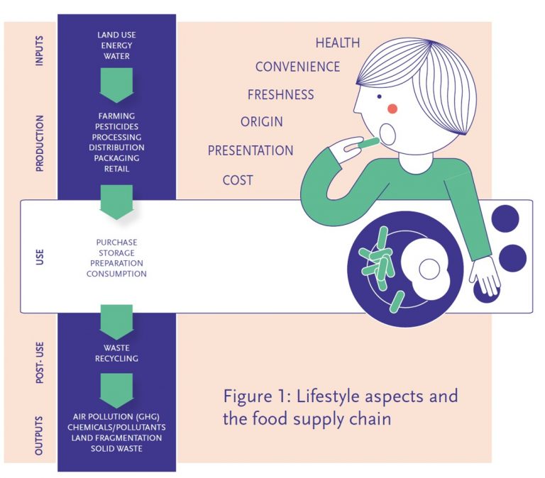 • อาหาร (Food) : อาหารและเครื่องดื่มที่เรากินและดื่ม ผลิตและแปรรูปอย่างไร และวิธีกำจัดเศษเหลือทิ้งทั้งหมดซึ่งทั้งหมดจะมีผลกระทบต่อสังคมและสิ่งแวดล้อม