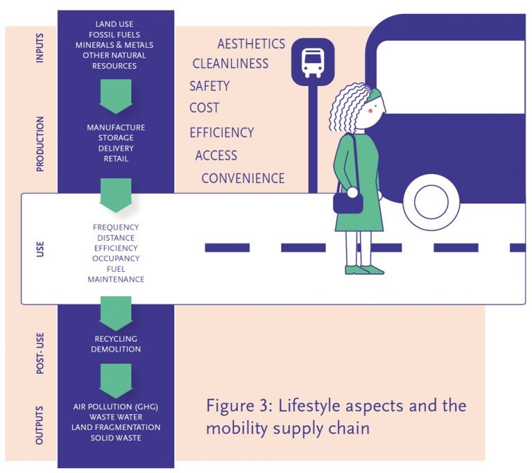 • การขนส่ง (Mobility) : การเลือกขนส่งรูปแบบใด ความถี่ที่ในการเดินทางและระยะทางที่เดินทางรวมถึงระบบสนับสนุน และโครงสร้างพื้นฐานมีผลกระทบต่อสังคมและสิ่งแวดล้อม