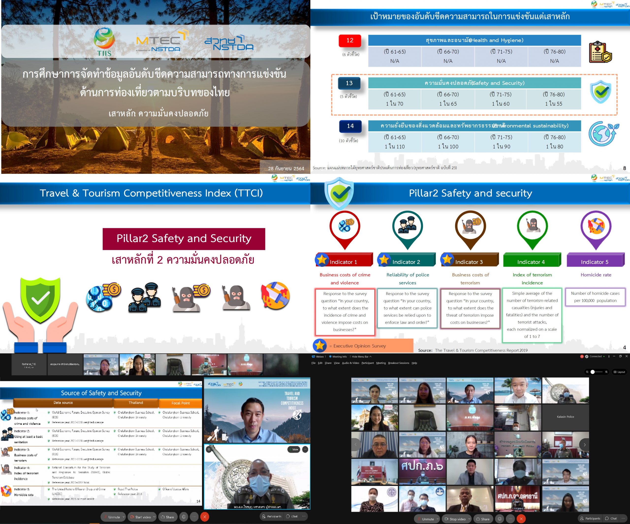 การจัดประชุมกลุ่มย่อย (Focus Group) เพื่อนำเสนอผลการศึกษาการจัดทำข้อมูลอันดับขีดความสามารถทางการแข่งขันด้านการท่องเที่ยวตามบริบทของไทย ในเสาหลักความมั่นคงปลอดภัย (Pillar: Safety and Security) จัดขึ้นเมื่อวันอังคารที่ 28 กันยายน 2564 เวลา 09.30 – 12.00 น. ผ่านระบบวีดีทัศน์ทางไกล (Video conference) ด้วยโปรแกรม Cisco Webex Meetings มีผู้เข้าร่วมประชุมจากหน่วยงานสำคัญของไทย อาทิ สภาหอการค้าไทยแห่งประเทศไทย กระทรวงการท่องเที่ยวและกีฬา สภาพัฒนาการเศรษฐกิจและสังคมแห่งชาติ สำนักงานตำรวจแห่งชาติ สำนักงานกิจการยุติธรรม และคณะพาณิชยศาสตร์และการบัญชี จุฬาลงกรณ์มหาวิทยาลัย